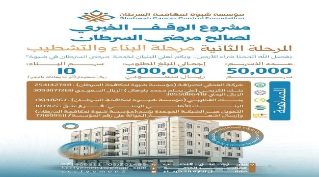 أعلنت مؤسسة شبوة لمكافحة السرطان عن انطلاق المرحلة الثانية من مشروع الوقف الخيري الاستراتيجي لدعم مرضى السرطان في المحافظة، والتي تشمل عمليات البناء والتشطيب النهائي للصّرح الإنساني، بعد استكمال المرحلة الأولى التي تضمنت شراء الأرض المخصصة للمشروع بدعم من أهل الخير.