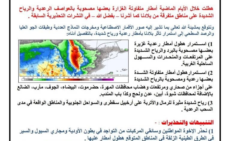 2) استمرار هطول أمطار متفاوتة الشدة بعضها رعدية ومصحوبة بالرياح الشديدة على أجزاء من صحاري ومرتفعات وهضاب محافظات المهرة، حضرموت، البيضاء، الجوف، مأرب، الضالع بالإضافة لمحافظات شبوة، أبين، عدن ولحج وكذا باب المندب.