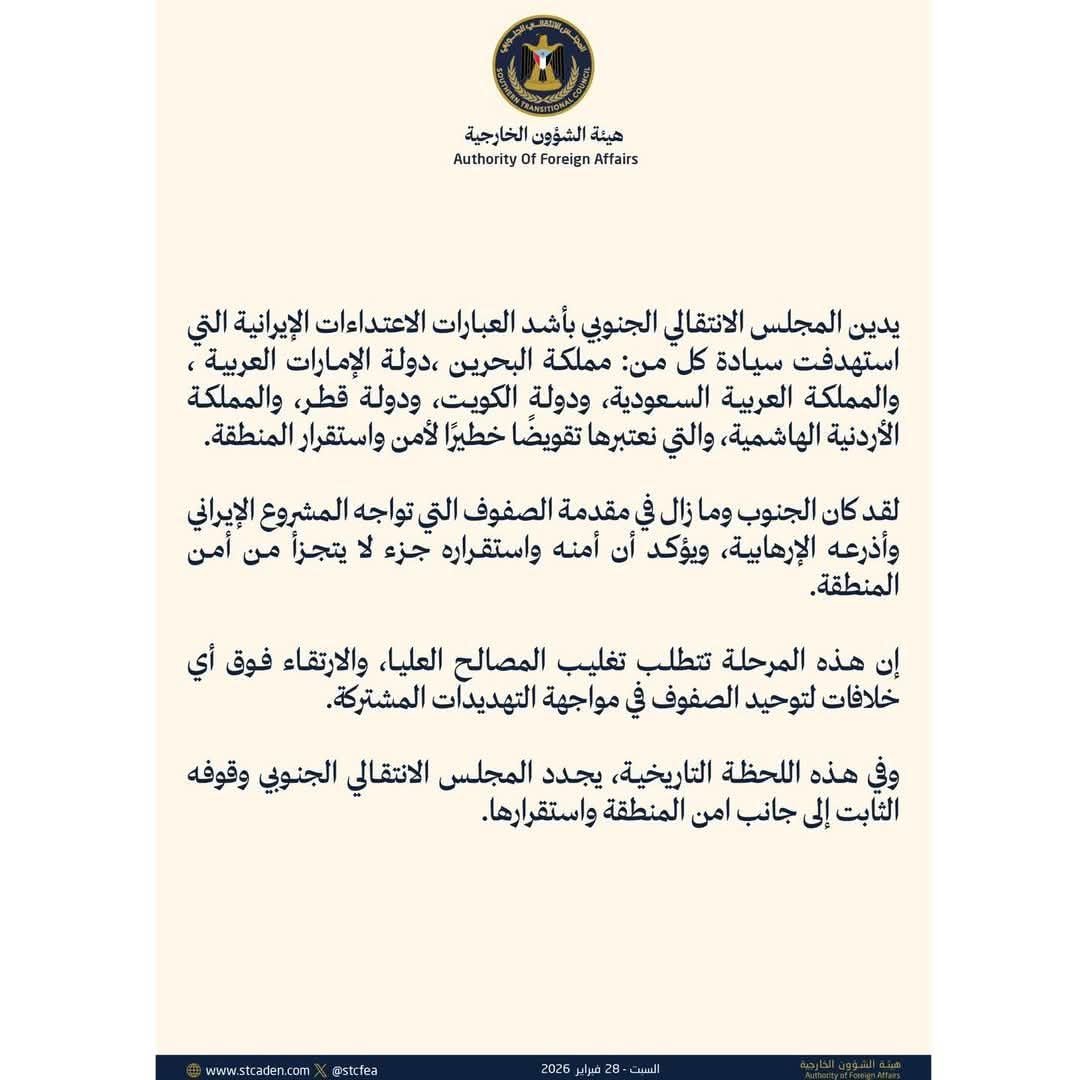 الانتقالي الجنوبي يدين الاعتداءات الإيرانية ويؤكد: أمن الخليج جزء من أمن الجنوب والمنطقة