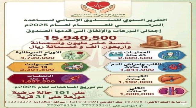 فخلال العام 2025م، بلغ إجمالي ما قدمه الصندوق 15,940,500 ريال، استفادت منها 101 حالة مرضية موزعة على 31 قرية في صورة تعكس حجم الثقة المجتمعية واتساع رقعة الخير.