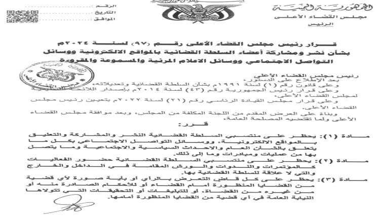 قرار رئيس مجلس القضاء الأعلى رقم (٩٧) لسنة ٢٠٢٤م بشأن نشر ومشاركة أعضاء السلطة القضائية بالمواقع الالكترونية ووسائل التواصل الاجتماعي ووسائل الاعلام المرئية والمسموعة والمقروءة
