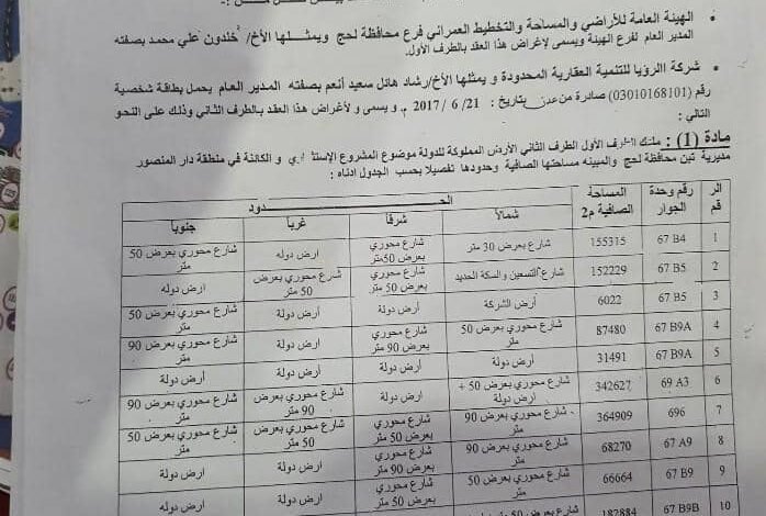 وتوضح الوثيقة أن العقد الذي أُبرم بين الهيئة العامة للأراضي في لحج، ممثلة بمديرها العام خلدون علي محمد، وشركة الرؤيا للتنمية العقارية المحدودة، التي يمثلها رشاد هائل سعيد أنعم، تم توقيعه في أغسطس 2018. وبموجب هذا العقد، تم تمليك الأرض الواقعة في منطقة دار المنصور بمديرية تبن لإقامة مشروع سكني استثماري مغلق يشمل خدمات ترفيهية وضرورية، وهو ما يكشف حجم الفساد ونهب اراضي الدولة والمواطنين الذي طال محافظة لحج وبتوجيهات رئاسية.