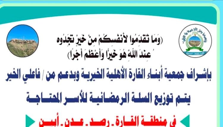 في بادرة إنسانية تهدف إلى دعم الأسر الفقيرة والمحتاجة خلال شهر رمضان المبارك، دشّنت جمعية أبناء القارة الأهلية الخيرية بمديرية يافع رصد، محافظة أبين، صباح اليوم الإثنين 25 شعبان 1446هـ الموافق 24 فبراير 2025، مشروع توزيع السلة الغذائية الرمضانية، الذي يستهدف أكثر من 350 أسرة فقيرة ومحتاجة في منطقة القارة، عاصمة المديرية رصد، وضواحيها، بالإضافة إلى الأسر الفقيرة من أبناء القارة القاطنين في جعار، الحصن، وعدن، وذلك بدعم ورعاية من فاعلي الخير من أبناء القارة المقيمين في دول الخليج.