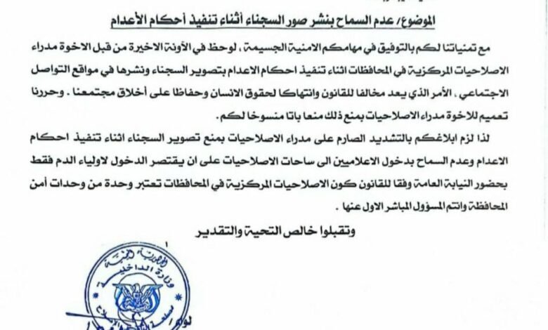 أصدرت وزارة الداخلية اليمنية توجيهات صارمة بمنع تصوير عمليات تنفيذ أحكام الإعدام بحق المدانين في قضايا القتل، سواء كانت الحدودية أو التعزيرية، مؤكدة أن ذلك يعد مخالفة قانونية وانتهاكًا لحقوق الإنسان.