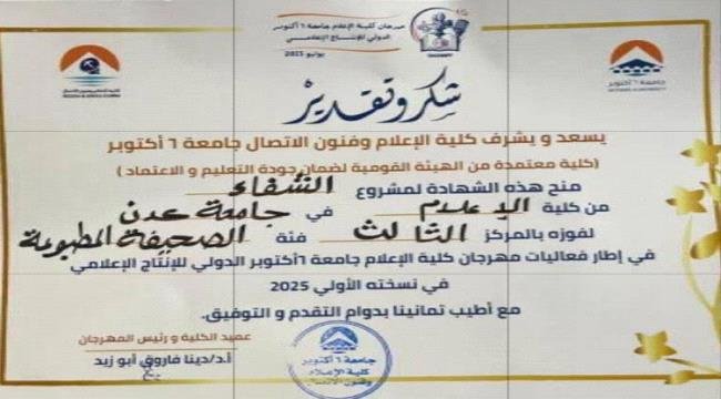 وجاء هذا الفوز عن مشروع التخرج “صحيفة الشفاء”، الذي قدمته الطالبة/إيمان رياض، من كلية الإعلام تخصص صحافة بجامعة عدن، منافسًا عشرات المشاريع المشاركة من جامعات عربية ودولية. وقد منحت اللجنة المنظمة الجائزة تقديرًا للمستوى المهني والإبداعي الذي أظهره المشروع، مما يعكس تميز طلاب الكلية وجهودهم في تجسيد مفاهيم الإعلام الهادف.