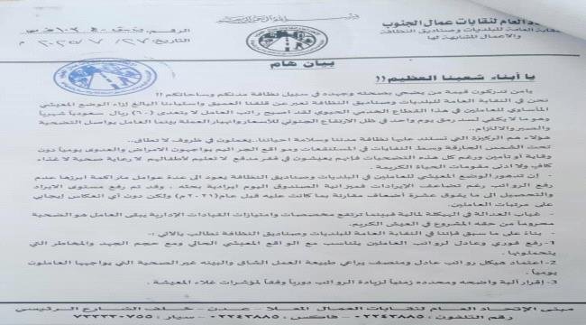 وفي هذا السياق، وجه الأستاذ يحيى ثابت أحمد، رئيس المكتب التنفيذي للنقابة العامة لعمال البلديات وصناديق النظافة والأعمال المشابهة، مذكرة رسمية إلى معالي وزير الدولة – محافظ العاصمة عدن، الأستاذ أحمد حامد لملس، شرح فيها نتائج الاجتماع وأرفق نسخة من البيان، مؤكدًا منح الجهات المعنية مهلة عشرة أيام للرد والاستجابة.
