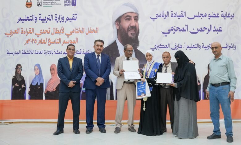 اختتم قطاع التعليم ممثلا بالإدارة العامة للأنشطة المدرسية بوزارة التربية والتعليم، اليوم الثلاثاء بالعاصمة عدن، فعاليات الحفل الختامي لأبطال تحدي القراءة العربي الموسم التاسع 2025م، برعاية نائب رئيس المجلس الانتقالي الجنوبي، عضو مجلس القيادة الرئاسي عبدالرحمن المحرمي وإشراف وزير التربية طارق العكبري.