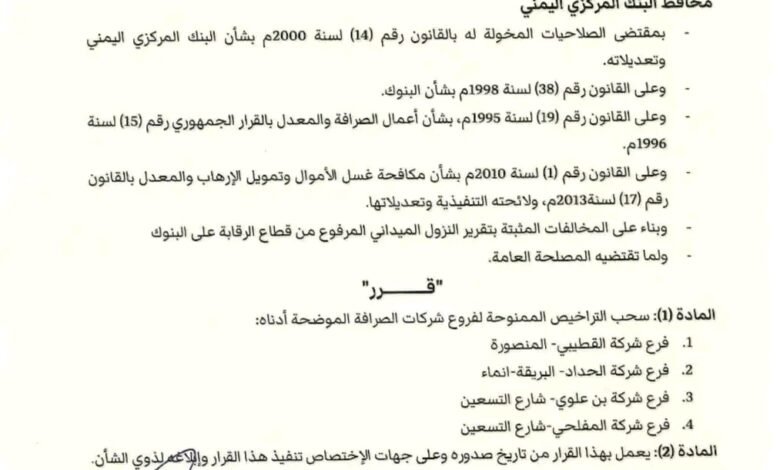 محافظ البنك المركزي يصدر قرارًا رقم 13 بشأن سحب تراخيص عدداً من فروع شركات الصرافة المخالفة