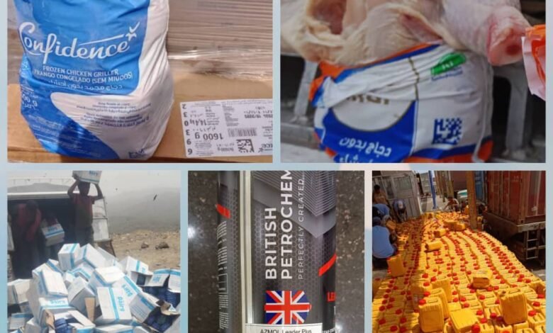 هيئة المواصفات والمقاييس ترفض كميات كبيرة من الدجاج المجمد الفاسد في عدن ومنتجات اخرى مخالفة في الوديعة وتعز