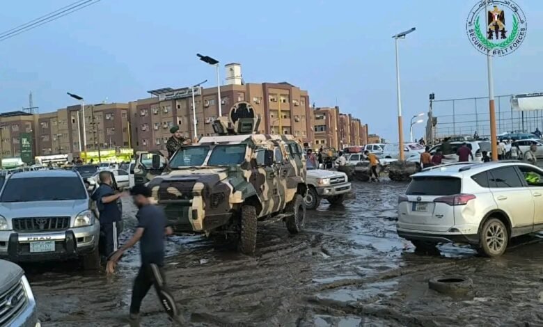 قوات الحزام الأمني تؤمّن مجرى السيول وتساند جهود الطوارئ في مديرية البريقة بالعاصمة عدن