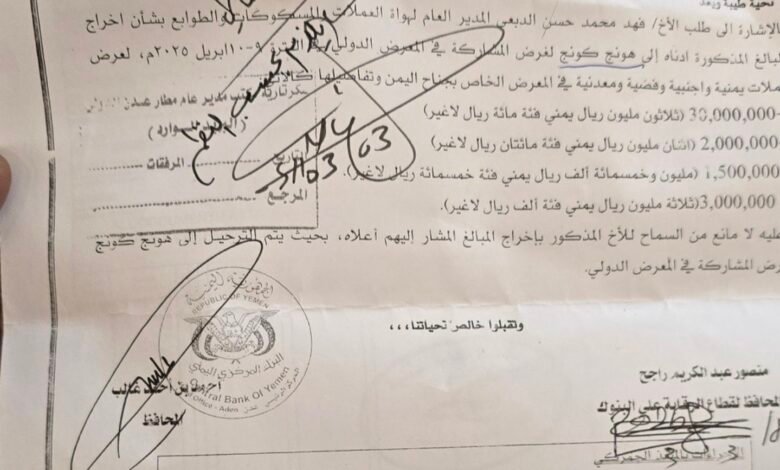 أثارت وثيقة رسمية صادرة عن البنك المركزي اليمني بتاريخ 3 مارس 2025، جدلًا واسعًا بعد كشفها عن إخراج مبلغ ثلاثين مليون ريال يمني جديد للمشاركة في معرض دولي للعملات في هونغ كونغ خلال الفترة من 9 إلى 10 أبريل الماضي.