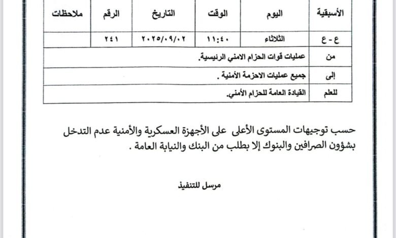 أصدرت القيادة العامة لقوات الحزام الأمني توجيهات مشددة إلى كافة وحداتها بعدم التدخل في شؤون البنوك وشركات الصرافة إلا في حال وجود تكليف رسمي صادر من النيابة العامة أو البنك المركزي اليمني.