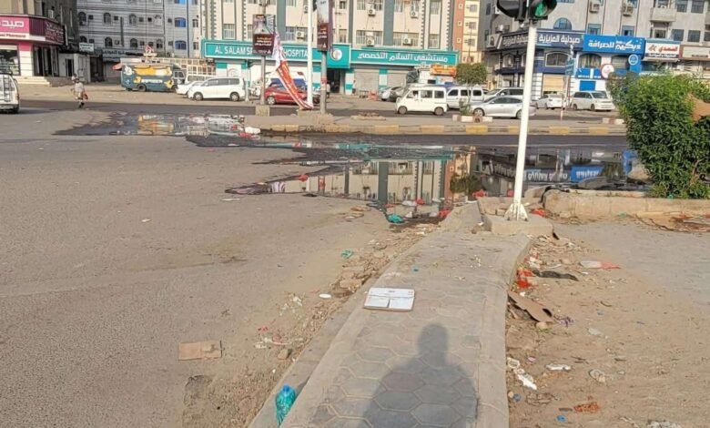 طفح للمجاري يغرق شارع التسعين بعدن ويعطل حركة السير