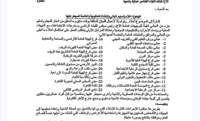 وأظهرت الوثيقة توجيهًا عاجلًا بإخلاء وإعادة أكثر من 25 مبنى ومنشأة حكومية سيطرت عليها جماعات مسلحة، استنادًا إلى تكليفات رئيس مجلس القيادة الرئاسي، وبالتنسيق مع قائد المحور العسكري ورئيس اللجنة الأمنية في المحافظة.