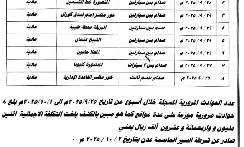 وأوضحت الإحصائية أن العاصمة عدن شهدت خلال الفترة نفسها (8) حوادث مرورية في عدد من المديريات، مسجّلة انخفاضًا بنسبة 43% مقارنة بالأسبوع السابق، مع تسجيل خسائر مادية قُدِّرت بنحو 2,420,000 ريال (مليونين وأربعمائة وعشرون ألف ريال).
