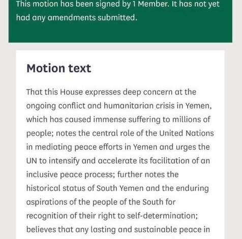 ((يعرب مجلس البرلمان البريطاني عن بالغ قلقه إزاء الصراع المستمر والأزمة الإنسانية في اليمن ، والتي تسببت في معاناة هائلة لملايين الأشخاص)).