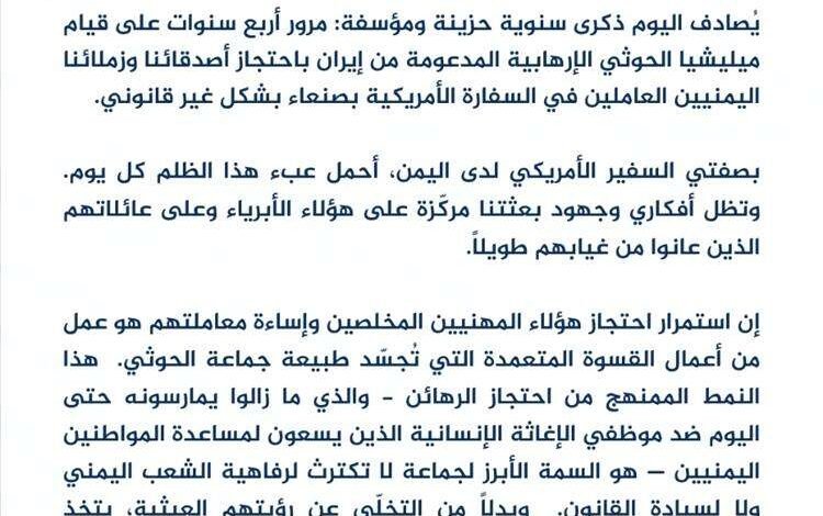 أصدرت السفارة الأمريكية بيانًا رسميًا بمناسبة مرور أربع سنوات على احتجاز جماعة الحوثي لعدد من موظفي السفارة الأمريكية في صنعاء، واصفة الحادثة بأنها «عمل غير قانوني ومخزٍ» يستهدف أبرياء خدموا في إطار إنساني ومهني بحت.