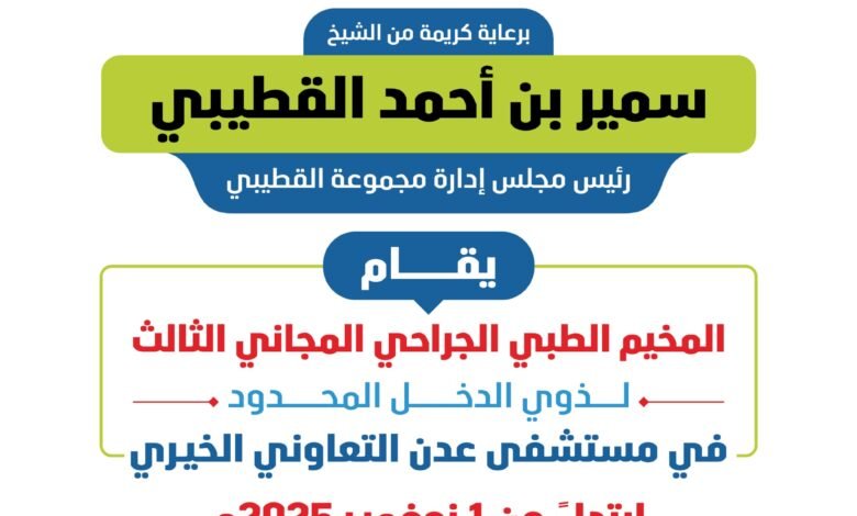 ينطلق في الأول من نوفمبر 2025م المخيم الطبي الجراحي المجاني الثالث في مستشفى عدن التعاوني الخيري، برعاية كريمة من رجل الأعمال الشيخ سمير القطيبي، رئيس مجلس إدارة مجموعة القطيبي، وذلك استمراراً للجهود الإنسانية الرامية إلى تخفيف معاناة المرضى من ذوي الدخل المحدود.