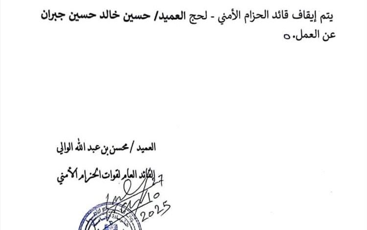 ولم يوضح القرار أسباب الإيقاف، فيما يُتوقع أن تصدر قيادة الحزام الأمني في وقت لاحق بيانًا لتوضيح خلفيات القرار وأبعاده.