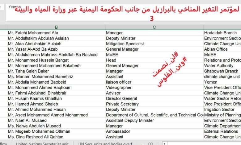 تفجّرت موجة غضب واسعة في الأوساط اليمنية عقب نشر وثائق تضم نحو 140 اسماً من المشاركين المسجّلين لحضور مؤتمر المناخ في البرازيل عبر وزارة المياه والبيئة، في ظل تساؤلات حادّة حول مصادر تمويل هذه السفرات، ومعايير اختيار المشاركين، وغياب الشفافية في إدارة الأموال العامة.