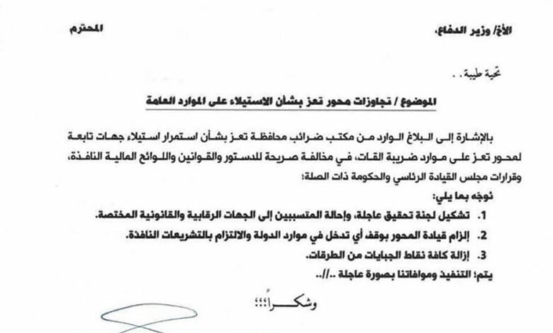 وشدد رئيس الوزراء في توجيهاته على سرعة تشكيل لجنة تحقيق عاجلة، وإحالة كافة المتسببين في عملية الاستيلاء إلى الجهات الرقابية والقانونية المختصة، إضافة إلى إلزام قيادة محور تعز بوقف أي تدخل في موارد الدولة، وإزالة جميع نقاط الجبايات المخالفة من الطرق بشكل فوري.