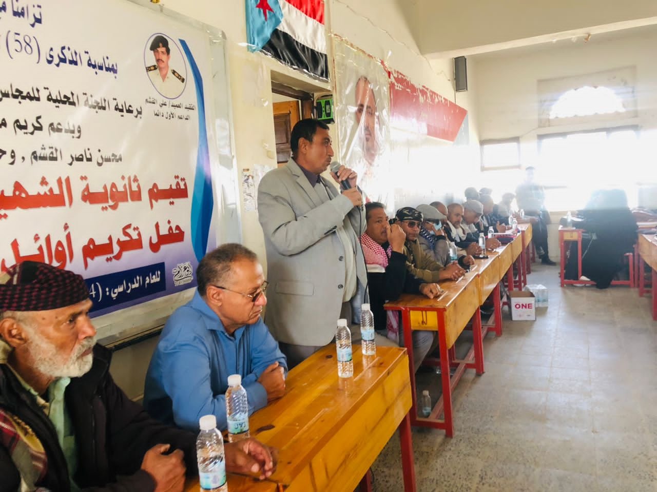 ومن جانبه، أثنى رجل الخير أبو مطهر القشم على جهود إدارة الثانوية والمعلمين وهيئة التدريس، معبّراً عن سعادته بحضور الحفل في أقدم ثانوية بالمديرية. وأوضح أن التكريم يمثل حافزاً مهماً للطلاب، مشيراً إلى بعض الملاحظات المتعلقة بضرورة التزام الطلاب بالدوام المدرسي وعدم مغادرة الصفوف قبل الوقت المحدد.