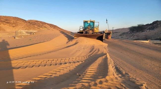 المؤسسة العامة للطرق تواصل إزالة الرمال على طريق عتق – بيحان