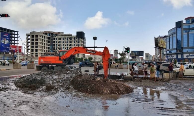 فرق صيانة مؤسسة مياه عدن تباشر إصلاح كسر في خط ضخ رئيسي بجولة كالتكس
