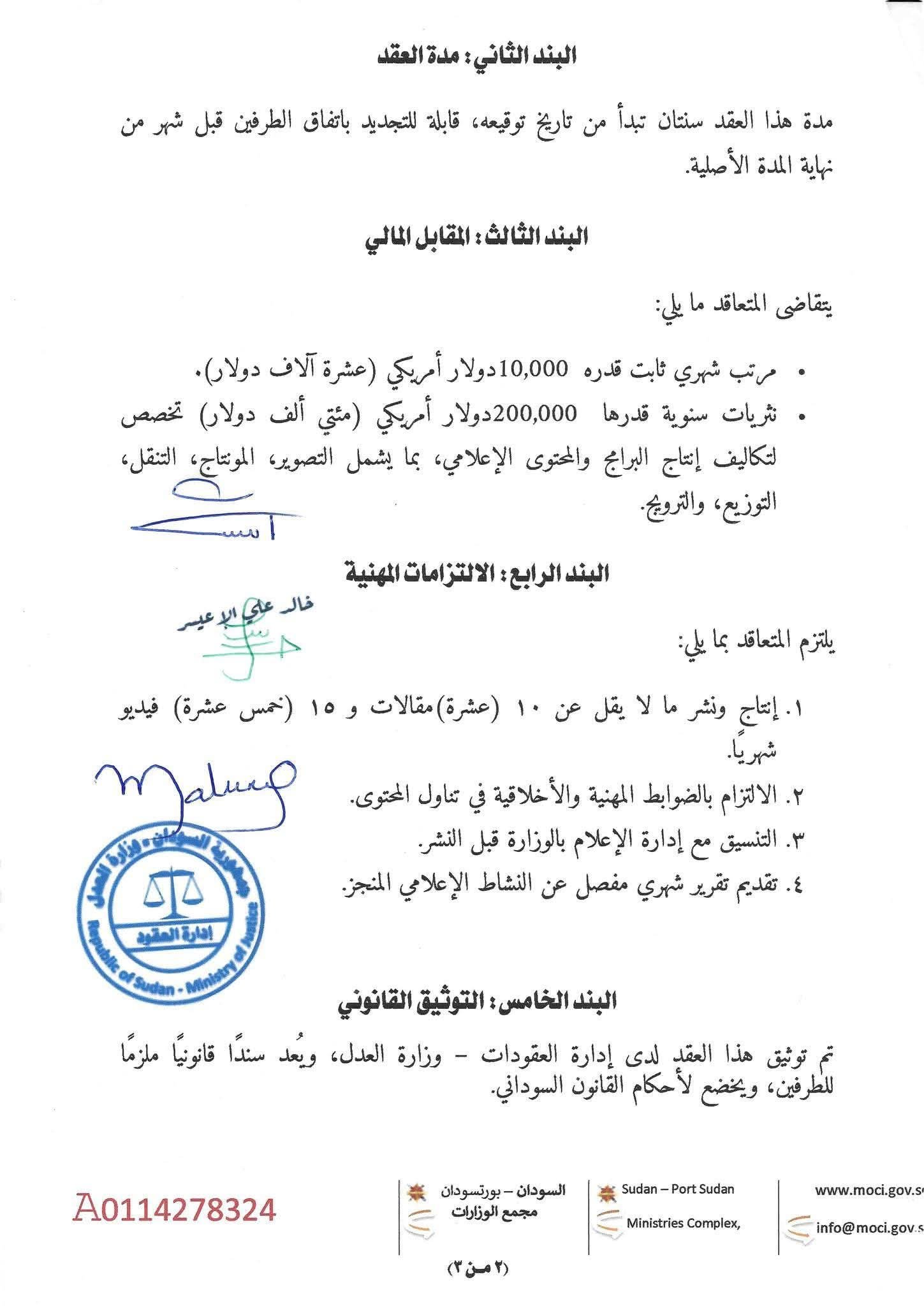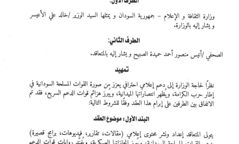 الوثيقة تُظهر اتفاقاً مفاجئاً يقضي بدفع 10,000 دولار راتباً شهرياً للصحفي المذكور، إضافة إلى 200,000 دولار نثريات سنوية مقابل خدمات إعلامية، في وقت لا يتجاوز فيه مرتب مدير الهيئة القومية للإذاعة والتلفزيون 300 دولار فقط!