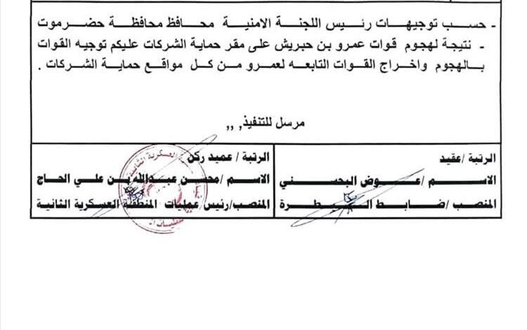 وجاء في الوثيقة العسكرية الصادرة عن مركز السيطرة في قيادة المنطقة الثانية، والموجهة إلى القيادات والوحدات الميدانية، أن التوجيهات صدرت بناءً على تعليمات رئيس اللجنة الأمنية محافظ حضرموت، وتضمنت توجيه القوات بالهجوم وإخراج القوات التابعة لعمرو من كل مواقع حماية الشركات .