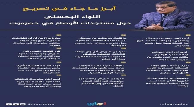 أبرز ماجاء في تصريح اللواء البحسني حول مستجدات الأوضاع في حضرموت.. انفوجرافيك