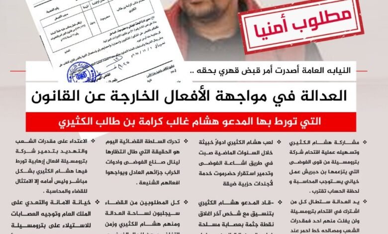 أصدرت جهات قضائية في حضرموت توجيهات جديدة تتعلق بملاحقة المدعو هشام غالب كرامة بن طالب الكثيري، على خلفية تورطه في أعمال توصف بأنها “إرهابية وتخريبية” استهدفت مؤسسات الدولة وعلى رأسها شركة بترومسيلة.