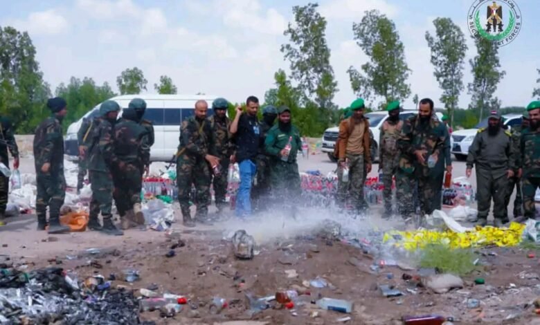 بإشراف العميد الوالي والنيابة العامة..إدارة مكافحة المخدرات بقوات الحزام الأمني تتلف كمية كبيرة من الخمور المستوردة