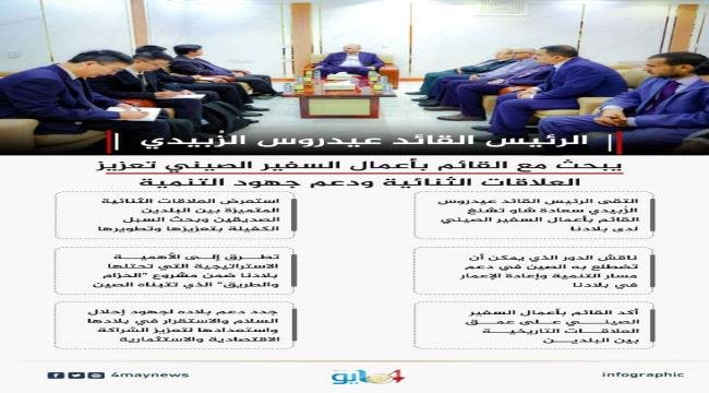 الرئيس الزُبيدي يبحث مع القائم بأعمال السفير الصيني تعزيز العلاقات الثنائية ودعم جهود التنمية.. انفوجرافيك