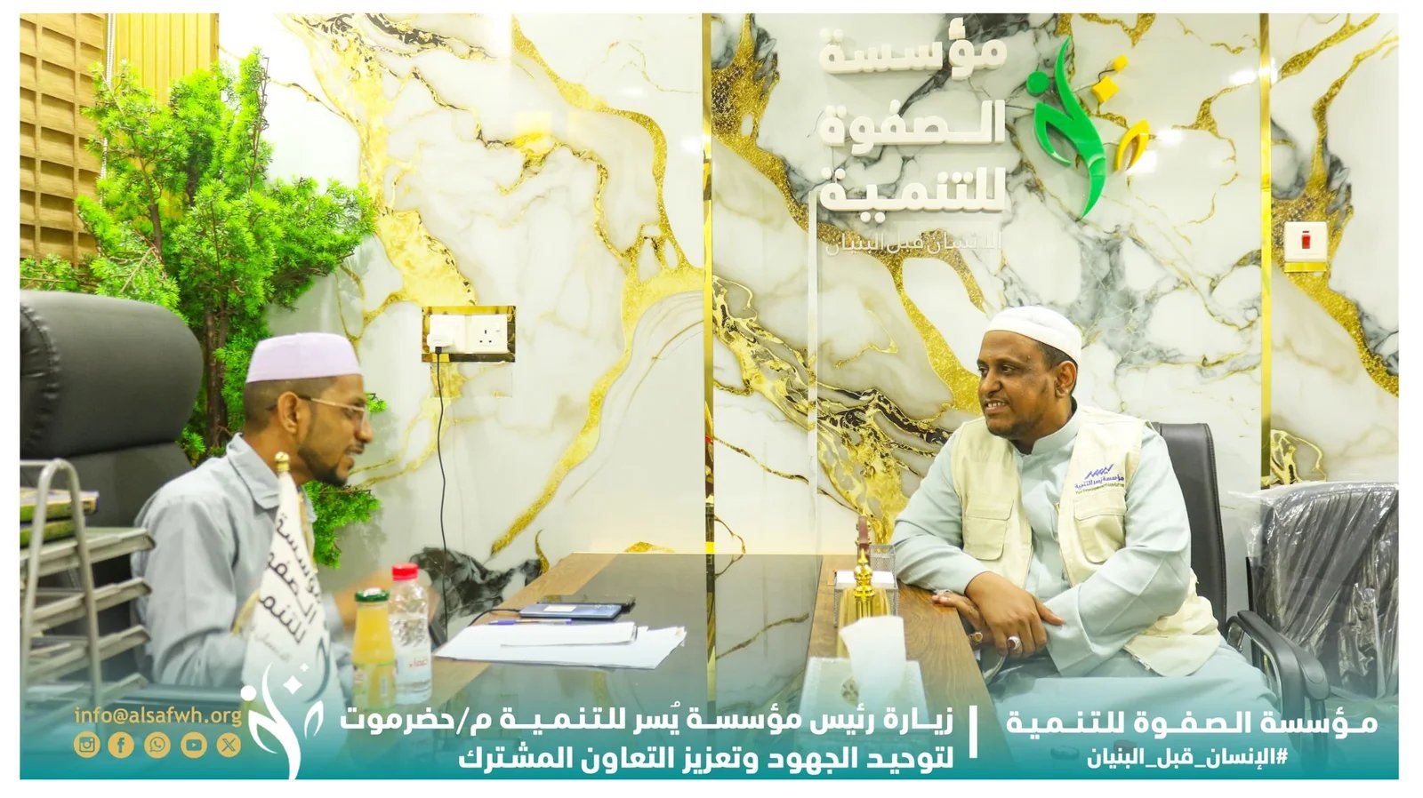 استقبل الأستاذ عمر سالم باصم، رئيس مؤسسة الصفوة للتنمية بالعاصمة عدن، رئيس مؤسسة يُسر للتنمية بمحافظة حضرموت، الأستاذ فواز باحمل، في زيارة رسمية هدفت إلى تعزيز جسور التعاون وبحث فرص التكامل في العمل الإنساني والتنموي بين الجانبين.