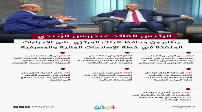 الرئيس الزُبيدي يطّلع من محافظ البنك المركزي على الإجراءات المنفذة في خطة الإصلاحات المالية والمصرفية..انفوجراف