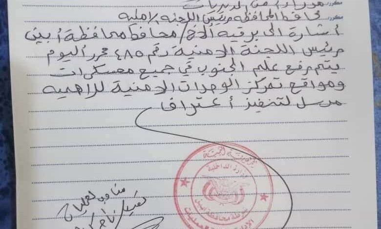 وأفادت مصادر محلية بأن المحافظ أصدر قرارًا يقضي برفع أعلام الجنوب فوق المعسكرات والأجهزة الأمنية في المحافظة.