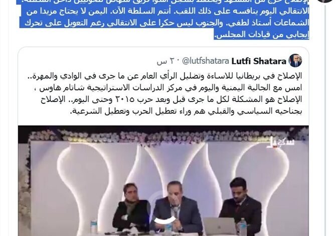 وكان القحطاني يعلق على تغريدات لعضو هيئة رئاسة الانتقالي لطفي شطارة، والذي أبدى مخاوف من حراك جديد للإصلاح يقوده القائم بأعمال الحزب عبدالرزاق الهجري من العاصمة البريطانية.
