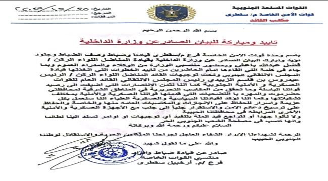 وأكد بيان صادر عن قيادة وضباط وأفراد قوات الأمن الخاصة بسقطرى، تثمينهم للدور القيادي لوزارة الداخلية، بقيادة اللواء الركن فضل عبدالله باعش، وما تضمنته كلمة القيادة من مواقف داعمة للمسار الوطني الجنوبي، وتعزيز الأمن والاستقرار.