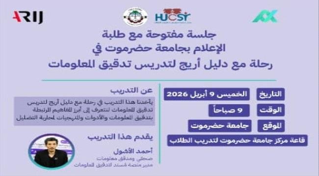 أعلنت الإدارة العامة للإعلام بجامعة حضرموت بالشراكة مع الشبكة العربية لمدققي المعلومات (أريج)، وبالتعاون مع مركز تدريب الطلاب بالجامعة، عن تنظيم جلسة نقاشية متخصصة في مجال تدقيق المعلومات يوم غدٍ، بعنوان “نحو إعلام مهني ومحتوى موثوق”.