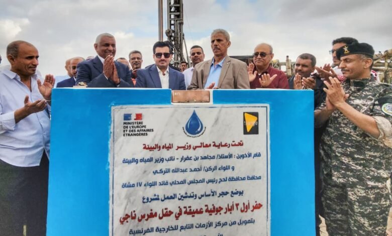 دشن محافظ محافظة لحج اللواء احمد عبدالله التركي و نائب وزير المياه والبيئة مجاهد بن عفرار، وضع حجر الأساس لمشروع حفر ثلاثة آبار جوفية عميقة في حقل مغرس ناجي بمحافظة لحج، برعاية وزارة المياه والبيئة، وبتمويل من مركز الأزمات التابع لوزارة الخارجية الفرنسية.