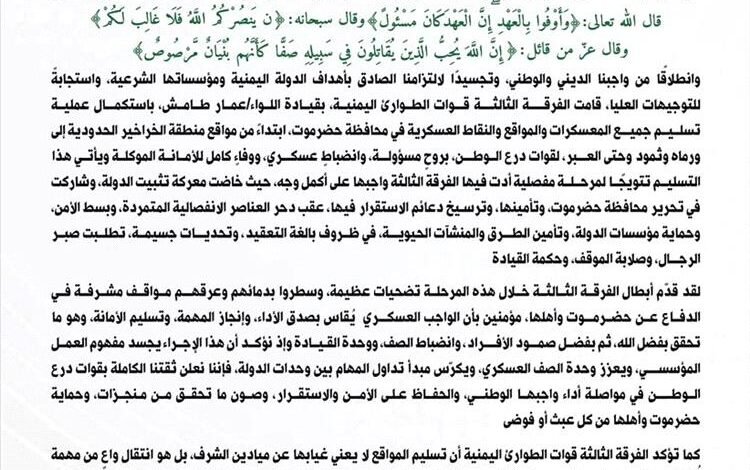 أعلنت الفرقة الثالثة – قوات الطوارئ اليمنية استكمال عملية تسليم جميع المعسكرات والمواقع والنقاط العسكرية في محافظة حضرموت لقوات درع الوطن، تنفيذًا للتوجيهات العليا، وبروح المسؤولية والانضباط العسكري.