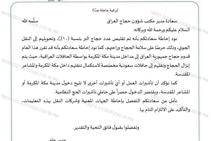 وتابع البيان: “كما نود إحاطة سعادتكم بأنه قد تقرر هذا العام قدوم حجاج جمهورية العراق إلى مداخل مدينة مكة المكرمة بواسطة الحافلات العراقية، حيث يتم إنزال الحجاج ونقلهم إلى حافلات سعودية مخصصة لاستكمال تنقلهم داخل مكة المكرمة والمشاعر”.