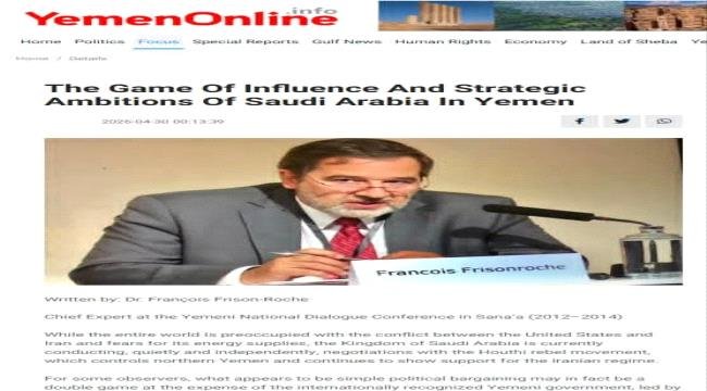 كشف تقرير تحليلي للخبير الفرنسي د. فرانسوا فريسون روش، نشره موقع Global Strat View، أن التحركات السعودية في اليمن لم تعد تندرج ضمن إطار تسوية سياسية تقليدية، بل تتجه نحو إعادة تشكيل موازين النفوذ في البلاد، في ظل مفاوضات مباشرة مع جماعة الحوثي وغياب واضح للحكومة اليمنية المعترف بها دوليًا.