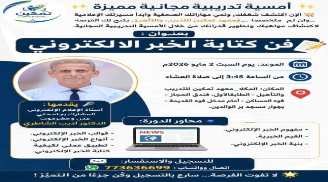 يستعد معهد تمكين للتدريب والتأهيل بالمكلا لتنظيم أمسية تدريبية مجانية بعنوان “فن كتابة الخبر الإلكتروني”، عصر السبت القادم 2مايو، بفندق الحجاز بفوه، بجوار مسجد بر الوالدين.