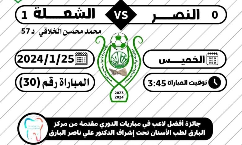 تمكن فريق الشعلة من الاطاحة بفريق النصر بهدف دون رد في القمة التي جمعتهم عصر يومنا هذا الخميس الموافق 25 /يناير/ 2024م لحساب الأسبوع الثامن والاول لمباريات إياب دوري نادي الشروق الممتاز مديرية الحد يافع 2023-2024 حيث انتهى الشوط الأول بالتعادل السلبي وفي الشوط الثاني احتسب الحكم ركلة جزاء لصالح فريق الشعلة ترجمها اللاعب محمد محسن الخلاقي بنجاح معلنا عن تقدم الشعلة بالهدف الاول ، نتيجة استمرت على حالها حتى انتهت القمة التي اوفت بكل وعودها وكسبها الفريق الشعلاوي بهدف النجم محمد الخلاقي ليرفع رصيده عقب هذا الفوز الى 14 نقطة في المركز الثاني بينما تراجع النصر الى المركز الثالث برصيد 13 نقطة.
