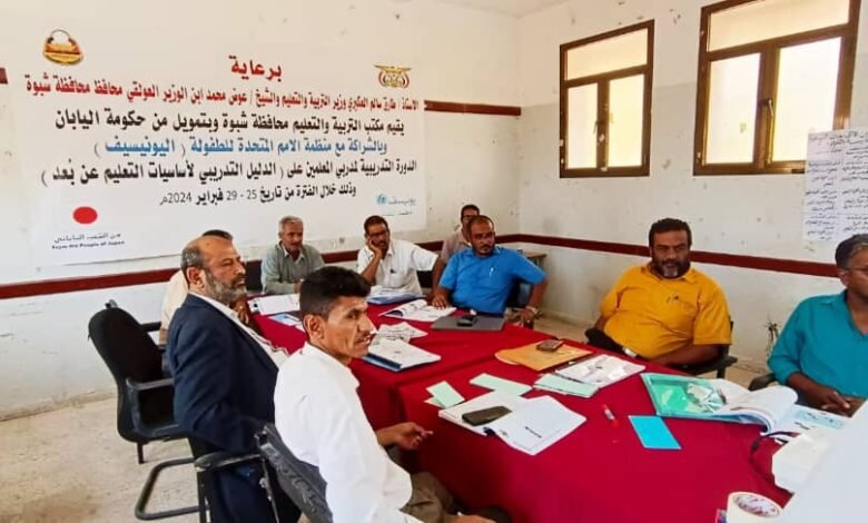 الدورة التدريبية لمدربي المعلمين على الدليل التدريبي لأساسيات التعليم عن بعد الذي ينفذه مكتب التربية والتعليم م/ شبوة وبتمويل من حكومة اليابان بالشراكة مع منظمة الأمم المتحدة للطفولة اليونسيف وذلك خلال الفترة من 25-29 فبراير 2024 م