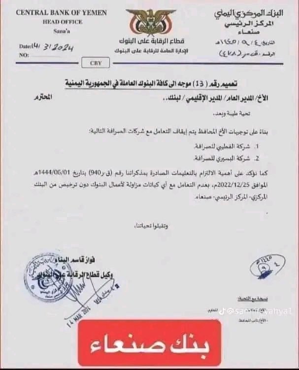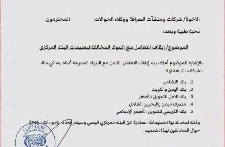 اصدر البنك المركزي الخاضع لسيطرة مليشيا الحوثي في صنعاء تعميما بايقاف التعامل مع كلا من