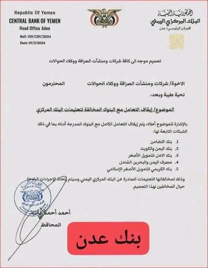 ليرد البنك المركزي اليمني في العاصمة عدن بتعميم ينص على إيقاف التعامل الكامل مع: