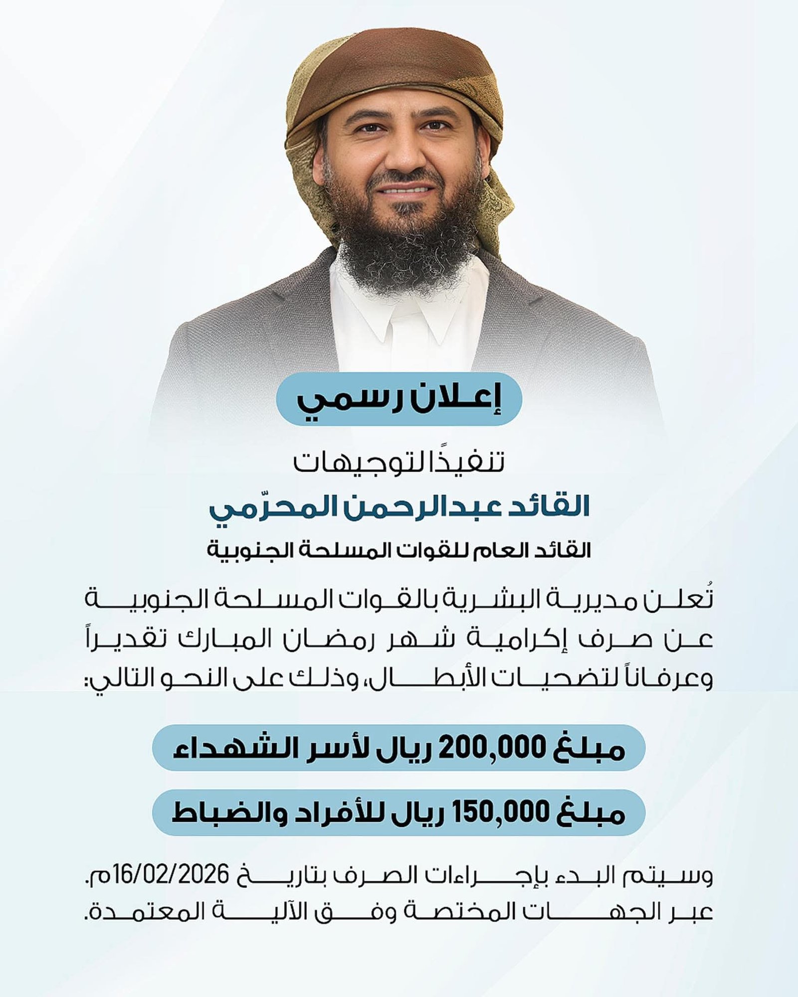 تنفيذاً لتوجيهات القائد عبدالرحمن المحرّمي، القائد العام للقوات المسلحة الجنوبية.. أعلنت مديرية البشرية العامة بالقوات المسلحة الجنوبية، عن صرف إكرامية شهر رمضان المبارك تقديراً وعرفاناً لتضحيات أبطال القوات المسلحة الجنوبية.